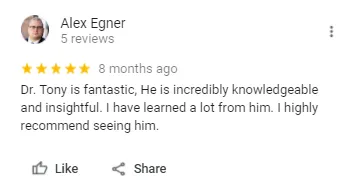Dr. Tony is truly committed to health evidenced in his own life and his family and bringing cutting edge health and wellness science to his patients. He has definitely helped me get back on track after dealing with prolonged digestive disorders. I recommend him highly.
